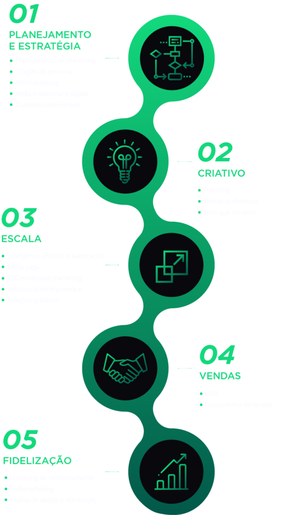 A nossa proposta é taylor-made, ou seja, nosso escopo de trabalho é projetado de acordo com a necessidade de nossos clientes. Temos como fundamento o marketing digital que mantém a presença da sua empresa nos canais que seu cliente está desde websites, landing pages, redes sociais até o ponto de venda.